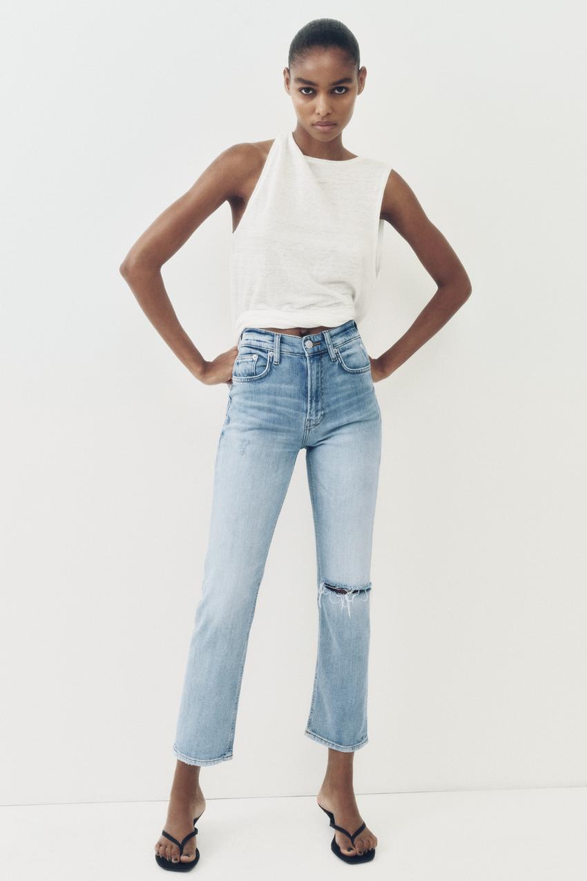 Cropped Jeans Zw Slim Mit Hohem Bund Mit Rissen Hellblau Zara Deutschland Germany